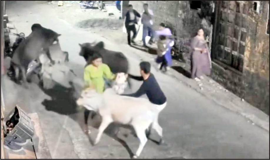 દ્વારકા તા. ર૩: યાત્રાધામ દ્વારકામાં રખડતા ઢોરનો ત્રાસ યથાવત્ હોય તેમ વિવિધ વિસ્તારોમાં આખલાઓ બાખડતા જોવા મળે છે. તાજેતરમાં ફૂલડોલ ઉત્સવ ખૂબ નજીક છે ત્યારે અને યાત્રાળુઓનો અવિરત પ્રવાહ દ્વારકા તરફ ફંટાઈ રહ્યો છે, ત્યારે દ્વારકાધીશ મંદિર નજીક ગોમતી ઘાટ વિસ્તારમાં ફરી એકવાર આખલાઓનો આતંક જોવા મળ્યો હોય તેમ સાંકડી ગલીમાં ધીંગાણું મચાવતા આખલાને કારણે ભીડભાડવાળા વિસ્તારમાં યાત્રાળુઓના જીવ અદ્ધરતાલ થઈ ગયા હતાં. અચાનક મચેલા આખલાઓના સમરાંગણમાં આશરે સાત જેટલા યાત્રાળુઓ માંડ માંડ બચ્યા હતાં અને યાત્રિકોમાં દોડધામ મચી ગઈ હતી અને સદ્નસીબે જાનહાનિ ટળી હતી. આ સમગ્ર ઘટના સીસી ટીવીમાં કેદ થઈ હતી. નગર પાલિકા દ્વારા આખલાઓને પકડવા થોડા સમય પહેલા પ્રાઈવેટ કોન્ટ્રાક્ટ આપેલ છે, પરંતુ હજુ સુધી અસરકારક કામગીરી દેખાતી ન હોય ઠેર ઠેર આખલાઓનો ત્રાસ યથાવત્ જોવા મળી રહ્યો છે.