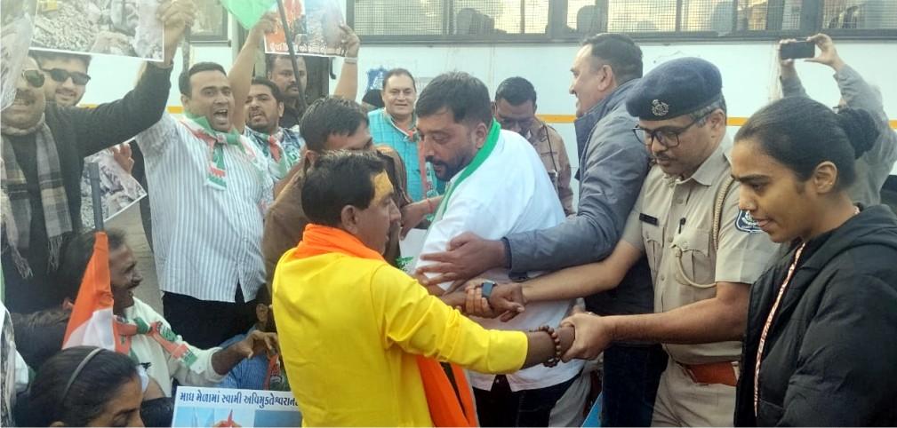 કોંગ્રેસ આગેવાનો દ્વારા આક્ષેપ કરાયો હતો કે, હિન્દુત્વની મોટી વાતો ભાજપ કરે છે. આવી ઘટના છતાં સરકાર મૌન છે. શંકરાચાર્યનું અપમાન સહન નહીં કરીએ, ધાર્મિક, વિરાસત તોડવાનું બંધ કરો, ભાજપ સરકાર હાય હાય, જબ જબ ભાજપ ડરતી હૈ પલીસ કો આગે કરતી હૈ. તેવા સૂત્રો પુકાર્યા હતાં. આ સાથે કોંગી કાર્યકરો અને પોલીસ વચ્ચે ખેંચાખેચી થઈ હતી.