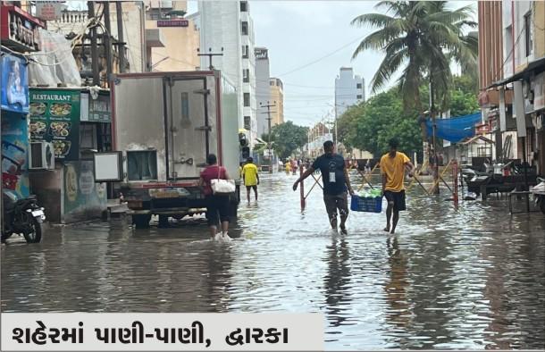દેવભૂમિ દ્વારકા જિલ્લામાં છેલ્લા ત્રણ દિવસથી મેઘરાજા મહેરબાન બન્યા છે. સતત વરસતા વરસાદે ગ્રામ્ય તેમજ શહેરી વિસ્તારોમાં જીવનપ્રવાહને અસર કરી છે. ખાસ કરીને ગઈકાલે એક જ દિવસમાં ૬ ઈંચ જેટલો વરસાદ પડતા દ્વારકા શહેરમાં પાણી ભરાવાની પરિસ્થિતિ સર્જાઈ હતી. વહેલી સવારે માત્ર બે કલાકમાં વધુ એક ઈંચ વરસાદ વરસતા દ્વારકા શહેરના ઈસ્કોનગેટ, ભદ્રકાલી ચોક અને આસપાસના મુખ્ય માર્ગો ઉપર વરસાદી પાણી ફરી વળ્યા હતાં, જેના કારણે વાહનચાલકોને ભારે મુશ્કેલીનો સામનો કરવો પડ્યો હતો. નિચાણવાળા વિસ્તારોમાં ઘરો અને દુકાનોમાં પણ પાણી ઘૂસી જતા લોકોએ પરેશાનીઓ અનુભવી પડી હતી.