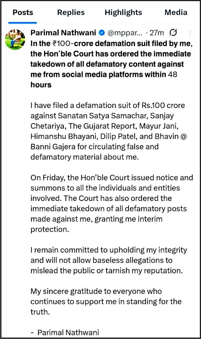 રાજયસભાના સંસદસભ્ય અને રિલાયન્સ કંપનીના ડાયરેક્ટર પરિમલભાઈ નથવાણી કે જેઓ સામે છેલ્લા કેટલાક સમયથી કંપનીના નામ સહિતની કેટલીક વિવાદીત પોસ્ટ મૂકવામાં આવી છે, અને તેઓની જાહેરમાં માનહાની થાય તે પ્રકારના કેટલાક સંંવાદ વગેરે સાથેની પોસ્ટ સોશિયલ મીડિયામાં વહેતી કરવામાં આવી રહી છે, જેના કારણે પોતાની બદનક્ષી અને માનહાની થઈ રહી છે, તે બાબતે અદાલતનું શરણ લીધું હતું, અને તેઓએ કોઈપણ પ્રકારની પાયા વિહોણી પોસ્ટ વહેતી કરનાર તમામ સામે ૧૦૦ કરોડનો માનહાનીનો દાવો દાખલ કર્યો છે.