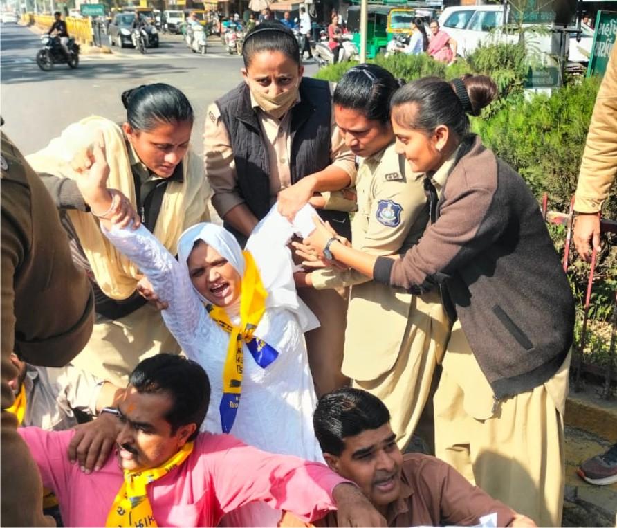 બિહારના મુખ્યમંત્રી નીતિશ કુમારે એક યુવતીનો હિજાબ ખેંચી તેણીનું જાહેરમાં અપમાન કર્યું હતું. તેના વિરોધમાં આજે જામનગરમાં લાલબંગલા સર્કલમાં આમઆદમી પાર્ટી દ્વારા આશ્ચર્યજનક કાર્યક્રમ સાથે વિરોધ પ્રદર્શન કરવામાં આવ્યું હતું. 'આપ'ના કાર્યકર્તાઓ દ્વારા નીતિશ કુમારની તસ્વીર ઉપર ચોકડી મારી પ્રસ્તુત કરી હતી અને તેમની તસ્વીરને પગ નીચે કચડી આક્રોશ વ્યક્ત કરી નીતિશ કુમાર માફી માગે તેવા સૂત્રો લખેલા પ્લેકાર્ડ દર્શાવ્યા હતાં. આખરે પોલીસ કાફલો પણ દોડી આવ્યો હતો અને 'આપ'ના કેટલાક કાર્યકરોની અટકાયત કરી હતી. આ કાર્યક્રમમાં 'આપ'ના શહેર પ્રમુખ રાજભા સોઢા, ઉપરાંત અસ્લમ ખીલજી, હાજી રીઝવાન જુણેજા, જેનબબેન ખફી સહિતનાઓ જોડાયા હતાં.
