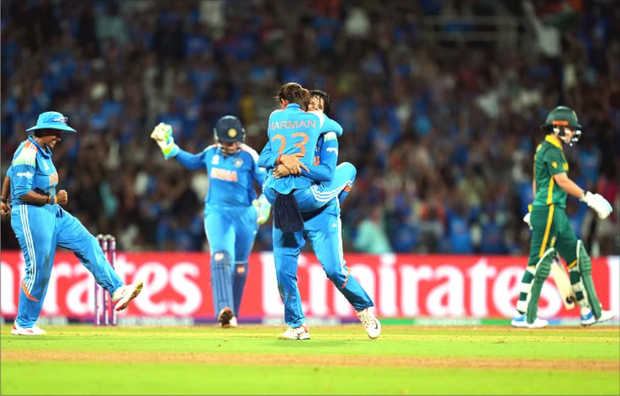 વુમન્સ વર્લ્ડ કપની ફાયનલમાં ભારતે સાઉથ આફ્રિકાને ૫૨ રનથી હરાવ્યું. ભારતીય કેપ્ટન હરમનપ્રીત કૌર ટ્રોફી લેવા પહોંચતા જ ભાંગડા કરવા લાગી હતી. ઈજાગ્રસ્ત પ્રતિકા રાવલ પણ વ્હીલચેરમાં જીતની ઉજવણી કરવા પહોંચી હતી. અમનજોત કૌરના કેચથી મેચ ભારતની તરફેણમાં થઈ ગઈ. તેણે સદી ફટકારી રહેલી સાઉથ આફ્રિકાની કેપ્ટન લૌરા વોલ્વાર્ટનો કેચ પકડ્યો. ટ્રોફી લેતી વખતે આઈસીસી ચેરમેન જય શાહ સ્ટેજ પર ટ્રોફી આપવા ઉભા હતા. ત્યારે કેપ્ટન હરમનપ્રીત કૌર સ્ટેજ પર ટ્રોફી લેવા ગઈ હતી. આ દરમિયાન તેણે પહેલા જય શાહ સાથે હાથ મિલાવ્યા અને પછી અચાનક જ તેને પગલે લાગી. જય શાહે તેને રોકી અને પછી ટ્રોફી આપી. મેચ પહેલા સિંગર સુનિધિ ચૌહાણે ભારતીય નેશનલ એન્થમ ગાયું હતું અને ક્રિકેટના દિગ્ગજ ખેલાડી સચિન તેંડુલકર પણ તેમની સાથે મેદાન પર હાજર હતા. ભૂતપૂર્વ ભારતીય ક્રિકેટર સચિન તેંડુલકરે રાષ્ટ્રગીત પહેલાં ટ્રોફી પ્રસ્તુત કર્યા પછી આખી મેચ નિહાળી હતી. તેમની સાથે આઈસીસી ચીફ જય શાહ પણ હાજર હતા. ભૂતપૂર્વ ભારતીય કેપ્ટન રોહિત શર્મા અને વીવીએસ લક્ષ્મણ ફાઈનલ મેચમાં હાજર રહ્યા હતા. રોહિત સાથે તેમની પત્ની રિતિકા અને પુત્રી સમાયરા પણ હતી. રોહિત શર્માને તાજેતરમાં ઓસ્ટ્રેલિયા સામેની વન-ડે સિરીઝમાં પ્લેયર ઓફ ધ સિરીઝ જાહેર કર્યો હતો.