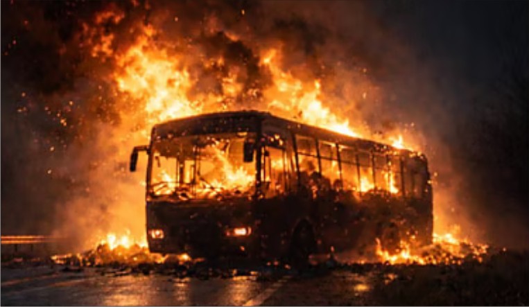 કન્ટેનર સાથે બસ અથડાઈને ભસ્મીભૂતઃ ટાયર ફાટતા બેકાબુ ટ્રકે બે કારને મારી ટક્કર
