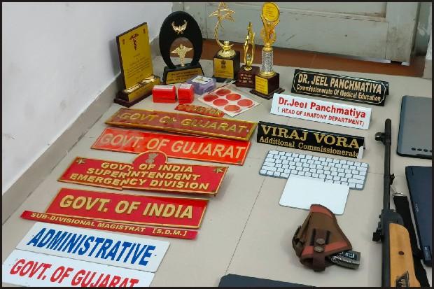 તા.રરની રાત્રે જીલ ભરતભાઈની અટકાયત કર્યા પછી તેના રિમાન્ડની માગણી કરી હતી. અદાલતે રિમાન્ડ મંજૂર કરતા ઉપરોક્ત બે ગુન્હા નોંધાવા પામ્યા છે. તે ઉપરાંત આજે સવારે પોલીસે વધુ સાત ગુન્હા નોંધ્યા છે. આ શખ્સ પાસેથી જીજે-૩૭-એમ ૨૮૧૬ નંબરની કીયા કંપનીની કેરેન્સ મોટર પણ કબજે કરવામાં આવી છે. તે ઉપરાંત કેટલાક સરકારી લેટરપેડ ઉપરાંત મોબાઈલ સહિતનો મુદ્દામાલ કબજે કરવામાં આવ્યો છે. આ શખ્સ પાસેથી કેટલાક ચંદ્રકો પણ કબજે થયા છે અને ગવર્મેન્ટ ઓફ ગુજરાત લખેલી કેટલીક નેમપ્લેટ મળી છે.