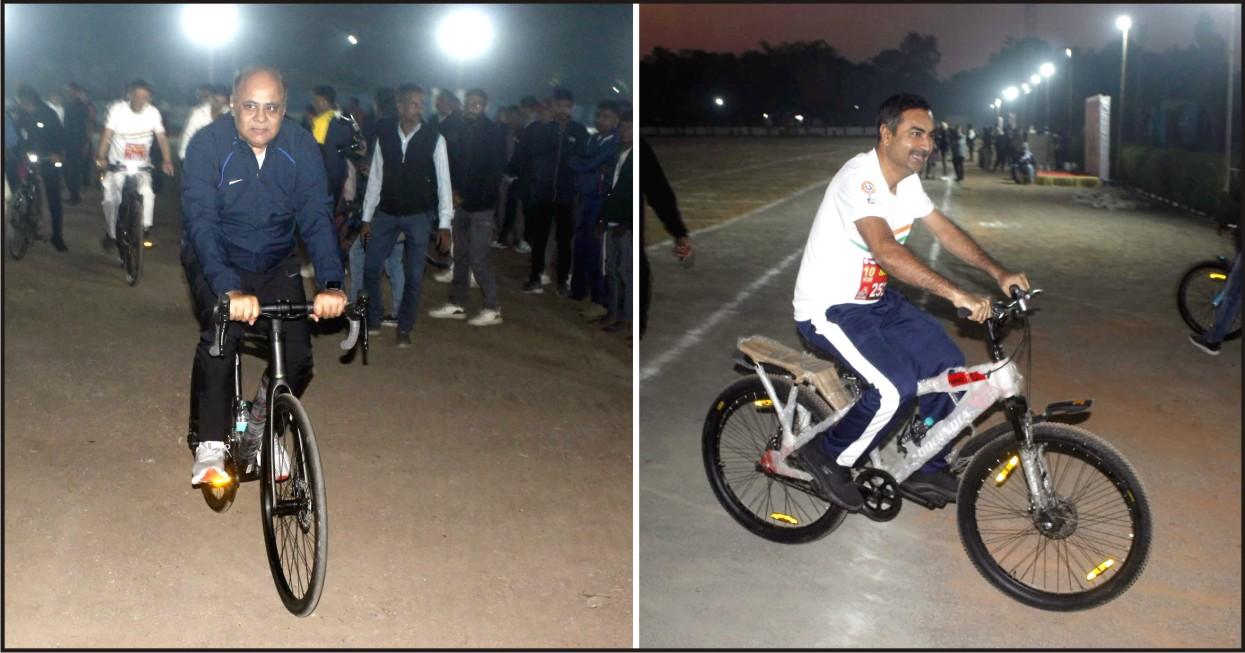 જામનગર મહાનગરપાલિકા દ્વારા ફીટ ઈન્ડિયા મુવમેન્ટ અંતર્ગત સ્વદેશી અપનાવોના સંદેશ સાથે તા. ૧૩ અને ૧૪ ના મેરેથોન અને સાયક્લોથોનનું આયોજન કરવામાં આવ્યું હતું. ગઈકાલે પોલીસ હેડ ક્વાટર્સથી બે કેટેગરીની સાયક્લોથોન યોજાઈ હતી, જેને ઉપસ્થિત મહાનુભાવોએ ઝંડી બતાવી પ્રસ્થાન કરાવી હતી. પ્રથમ ૧૦ કિ.મી.ની સાયક્યોથોન પોલીસ હેડ ક્વાટર્સથી શરૂસેક્શન રોડ, ગવર્મેન્ટ પોલટેકનિક કોલેજ, હાલાર સોલ્ટથી શરૂસેક્શન રોડથી પોલીસ હેડ ક્વાટર્સ અને રપ કિ.મી.ની સાયક્લોથોન પોલીસ હેડ ક્વાટર્સથી શરૂસેક્શન રોડ, ગવર્મેન્ટ પોલીટેકનિક કોલેજ, રોઝી પોર્ટ ગેઈટથી શરૂસેક્શન રોડ થઈ પોલીસ હેડ ક્વાટર્સ સુધી રાખવામાં આવી હતી. ગઈકાલે કડકડતી ઠંડીમાં વહેલી સવારે ૬-૩૦ કલાકે આયોજીત આ સાયક્લોથોનમાં રપ૦૦ લોકોએ રજિસ્ટ્રેશન કરાવ્યું હતું અને અસંખ્ય લોકો જોડાયા હતાં, અને સાયકલ ચલાવી ફીટ ઈન્ડિયા માટેનો સંદેશો આપ્યો હતો. આ કાર્યક્રમમાં ડેપ્યુટી મેયર ક્રિષ્નાબેન સોઢા, મ્યુનિ. કમિશનર ડી.એન. મોદી, ડીએમસી દેવેન્દ્રસિંહ ઝાલા, ડી.વાય.એસ.પી. ઝાલા, શાસક પક્ષના નેતા આશિષ જોષી, સિટી ઈજનેર ભાવેશ જાની, આસી. કમિશનર મુકેશ વરણવા સહિતનાઓ જોડાયા હતાં, અને અનેક સ્થાનિક નેતાઓ હાજર રહ્યા નહતાં. સાયક્લોથોનમાં જોડાયેલા તમામ સમર્થકોને યુનિક નંબર અને એસ્ટ નંબર આપવામાં આવ્યા હતાં, અને સ્પર્ધા પૂર્ણ કરનારાઓના નામનો ટોકન સિસ્ટમથી ડ્રો કરીને બન્ને કેટેગરીમાં દસ-દસ સાયકલ આપવામાં આવી હતી. સ્ણર્ધકો માટે સમગ્ર રૂટ ઉપર પાણી, સોફ્ટડ્રીંકની વ્યવસ્થા કરવામાં આવી હતી. ઉપરાંત મેડિકલ, ફાયર ટીમ ખડેપગે રહી હતી. આ ઈવેન્ટમાં ખાનગી પાર્ટીઓનો સાયકલ-ટી શર્ટ માટે સહયોગ મળ્યો હતો.