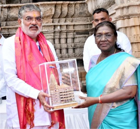 દ્વારકાધીશ મંદિરમાં પ્રવાસન મંત્રી મૂળુભાઈ બેરા, જિલ્લા કલેક્ટર રાજેશ તન્ના, રેન્જ આઈજી અશોકકુમાર યાદવ, પોલીસ અધિક્ષક જયરાજસિંહ વાળા, પ્રાંત અધિકારી અમોલ આવતે, વહીવટદાર તથા નાયબ કલેક્ટર હિમાંશુ ચૌહાણએ ઉપરણું, દ્વારકા મંદિરની પ્રકૃતિ, ફૂલ અને તુલસીમાંથી નિર્મિત અનુગ્રહમ અગરબત્તી, ગોલ્ડ પ્લેટેડ દ્વારકાધીનું સ્વરૂપ તથા પ્રસાદ આપી તેઓનું અદકેરૂ સ્વાગત કર્યું હતું. રાષ્ટ્રપતિશ્રી સાથે તેમના દીકરી ઈતિશ્રી મુર્મુ અને મહાનુભાવો જોડાયા હતાં.
