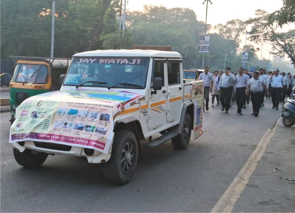 પશ્ચિમ ગુજરાત વીજ કંપની લિમિટેડ (પીજીવીસીએલ) જામનગર વર્તુળ દ્વારા ગઈકાલે વીજ સલામતી તથા ઊર્જા સંરક્ષણ અંગે જાગૃતિ ફેલાવવાના હેતુસર જનજાગૃતિ રેલીનું આયોજન કરવામાં આવ્યું હતું. આ રેલી સાંજે ૫ વાગ્યે લાલબંગલો કંપાઉન્ડ નજીક થી પ્રારંભ કરવામાં આવી હતી. રેલીમાં પીજીવીસીએલના અધિકારીઓ, કર્મચારીઓ તેમજ મોટી સંખ્યામાં જનતાએ ભાગ લીધો હતો. રેલી દરમ્યાન વીજ સલામતી રાખો જીવન સુરક્ષિત બનાવો, ઊર્જા બચાવો ભવિષ્ય બચાવો જેવા સુત્રો ધરાવતા બેનર અને પોસ્ટરો દ્વારા જનતાને સંદેશ આપવામાં આવ્યો હતો.રેલી દરમિયાન લોકોને ઘરેલું તથા ઔદ્યોગિક સ્તરે વીજ ઉપકરણોનો સુરક્ષિત ઉપયોગ કરવા, ખુલ્લા વાયરથી દૂર રહેવા, વીજ અકસ્માતોથી બચવા જરૂરી તકેદારી રાખવા તેમજ અનાવશ્યક વીજ વપરાશ ટાળીને ઊર્જા સંરક્ષણ કરવા અંગે માર્ગદર્શન આપવામાં આવ્યું હતું. પીજીવીસીએલ જામનગર વર્તુળ દ્વારા આયોજિત આ જનજાગૃતિ કાર્યક્રમથી નાગરિકોમાં વીજ સલામતી અને ઊર્જા બચત અંગે સકારાત્મક સંદેશ ફેલાયો હતો.