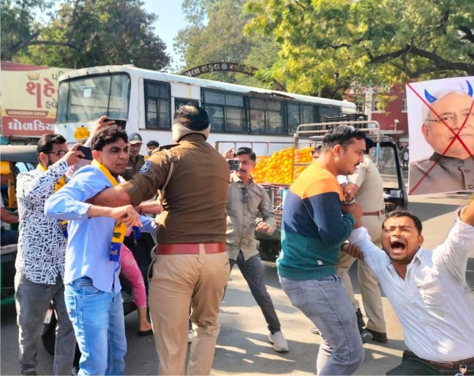 બિહારના મુખ્યમંત્રી નીતિશ કુમારે એક યુવતીનો હિજાબ ખેંચી તેણીનું જાહેરમાં અપમાન કર્યું હતું. તેના વિરોધમાં આજે જામનગરમાં લાલબંગલા સર્કલમાં આમઆદમી પાર્ટી દ્વારા આશ્ચર્યજનક કાર્યક્રમ સાથે વિરોધ પ્રદર્શન કરવામાં આવ્યું હતું. 'આપ'ના કાર્યકર્તાઓ દ્વારા નીતિશ કુમારની તસ્વીર ઉપર ચોકડી મારી પ્રસ્તુત કરી હતી અને તેમની તસ્વીરને પગ નીચે કચડી આક્રોશ વ્યક્ત કરી નીતિશ કુમાર માફી માગે તેવા સૂત્રો લખેલા પ્લેકાર્ડ દર્શાવ્યા હતાં. આખરે પોલીસ કાફલો પણ દોડી આવ્યો હતો અને 'આપ'ના કેટલાક કાર્યકરોની અટકાયત કરી હતી. આ કાર્યક્રમમાં 'આપ'ના શહેર પ્રમુખ રાજભા સોઢા, ઉપરાંત અસ્લમ ખીલજી, હાજી રીઝવાન જુણેજા, જેનબબેન ખફી સહિતનાઓ જોડાયા હતાં.